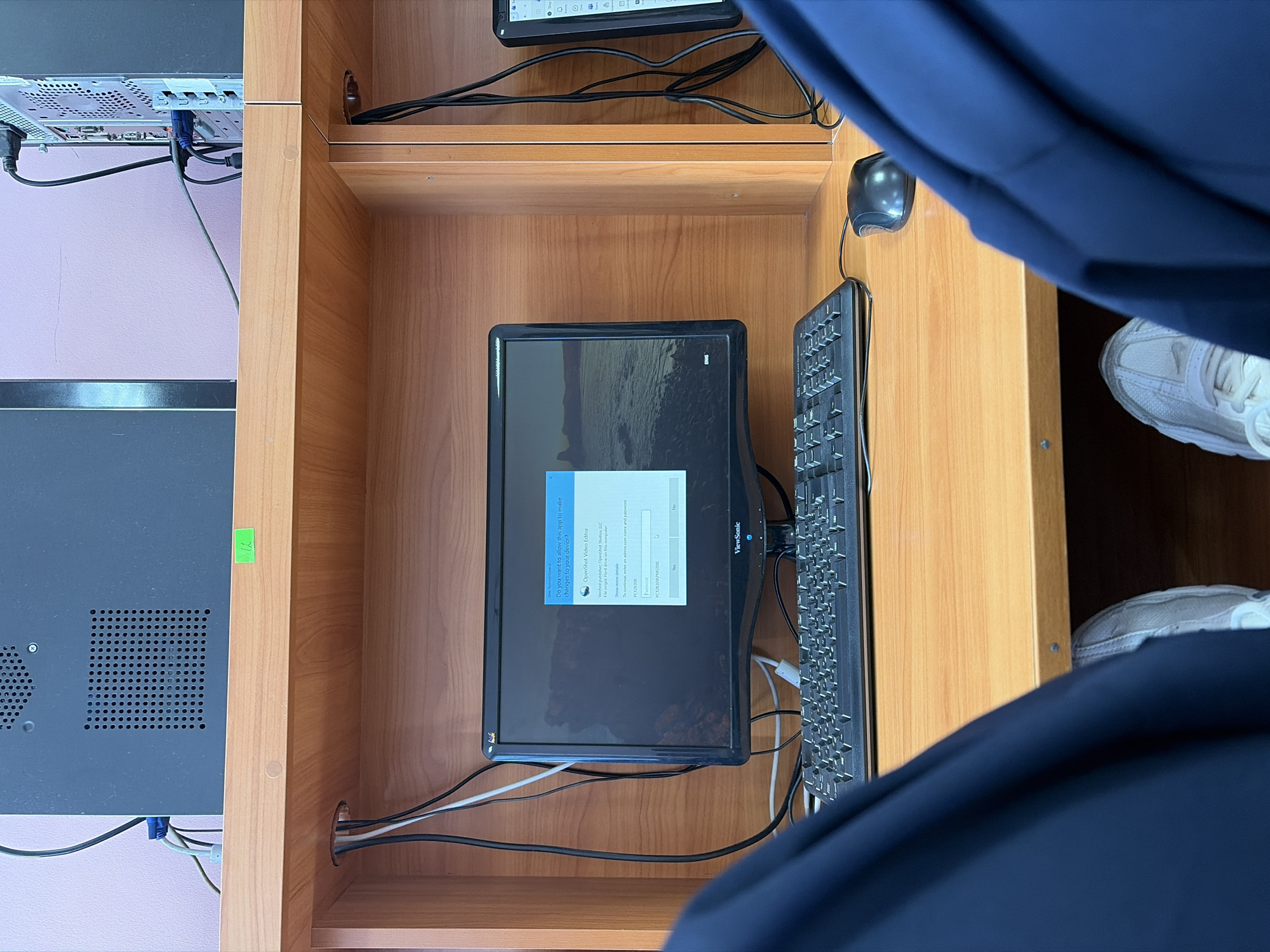 This image shows a computer setup within a wooden cabinet, likely a workstation in an office or educational environment. The setup includes a desktop computer tower to the left, a monitor, a keyboard, and a mouse. The monitor displays a User Account Control window, requesting permission to allow OpenShot Video Editor to make changes to the device. Cables are visible running through a hole in the cabinet's back. The setup appears to be in a closed space with someone sitting in front of it, as suggested by the presence of clothing (navy blue top and white shoes) in the foreground. Without additional information, it's impossible to precisely locate the setup in Blagoevgrad, Bulgaria.