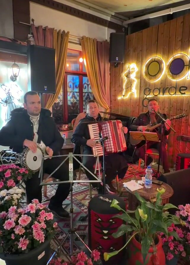 Three men are playing musical instruments in what appears to be a bar or lounge. The man on the left is playing a doumbek, the man in the middle is playing an accordion, and the man on the right is playing a guitar and singing. They are all sitting on chairs, and music stands with sheet music are in front of the accordion player and guitarist. In the foreground, there are several pots of pink flowers. There is also a patterned rug under the band. Behind the band, there is a wooden wall with a lighted sign that says "OO garde." There are also speakers and a window with red and orange curtains.