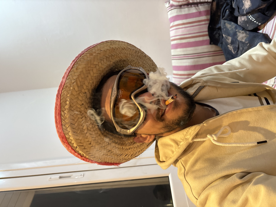 A male individual is depicted in a medium close-up, seated indoors in M'Diq, Morocco. He is wearing a beige hooded sweatshirt, a light-colored T-shirt with horizontal stripes, a straw hat with a red-edged brim, and large, light-framed ski goggles with orange-tinted lenses over his eyes. He has a dark beard and is smiling towards the viewer. A lit cigarette is held in his mouth, emitting a significant plume of smoke that partially obscures the lower portion of his face, hat, and goggles. To the left, a white window frame with a latch is visible. To the right, a striped cushion in shades of pink and white is present, behind which dark fabric, possibly clothing, lies on a surface. The background is a light-colored wall.