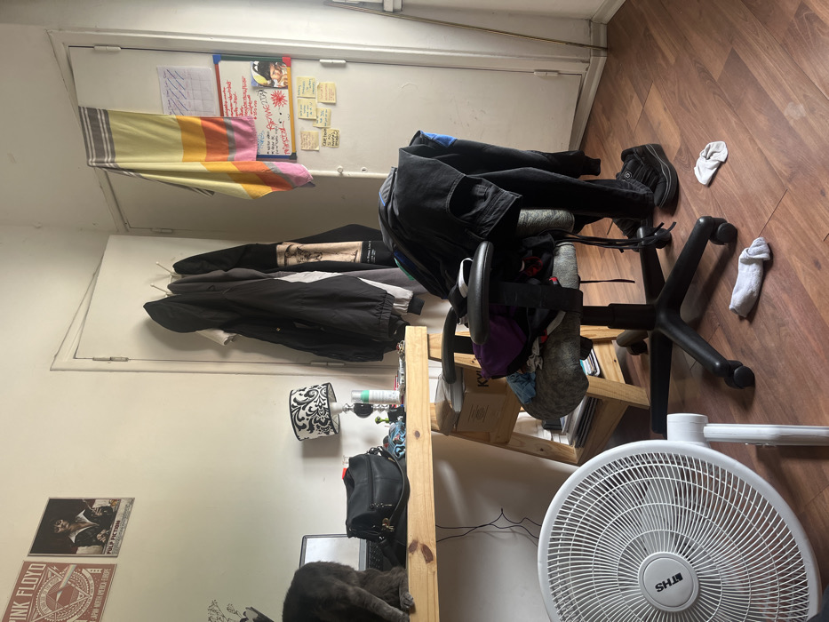 A cluttered room with a mix of personal items. Clothes hang on a rack against a white door adorned with sticky notes and a whiteboard. A black chair is piled with clothing and other items. A small, makeshift wooden shelf holds accessories and is overlooked by a gray cat. A white fan stands in the corner. Socks are strewn on the wooden floor next to a shoe. Posters are on the wall.