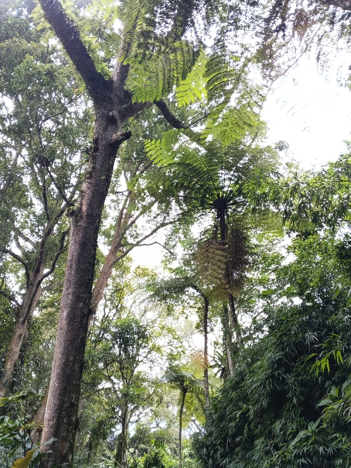 The scene depicts a dense tropical forest environment, viewed from a low angle looking upwards towards the canopy. The location is specified as Bangalum Bridge, Papua New Guinea. The primary subjects are numerous trees of varying heights and species, characterized by lush green foliage. In the left foreground, a large tree trunk, dark brown with patches of lighter moss or lichen, rises vertically and branches out into a canopy of green leaves. Adjacent to it and further into the midground, multiple other tree trunks and branches are visible, also heavily foliated. Several large tree ferns are prominent subjects, particularly one in the upper right quadrant exhibiting a distinct radial pattern of green fronds at its crown, and another with fronds extending downwards. The sky, visible through gaps in the dense canopy, appears bright and overcast, diffusing the natural light. The overall color palette is dominated by various shades of green from the abundant vegetation. No human subjects, animals, or man-made objects are present. No discernible actions or interactions are occurring; the scene is a static depiction of a natural forest landscape.