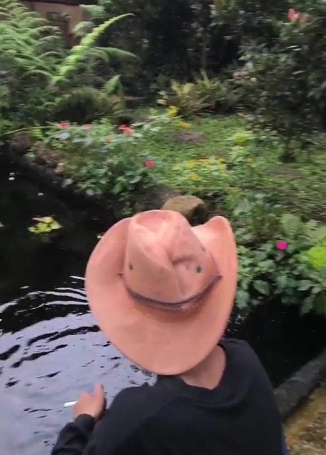 A person wearing a cowboy hat and a black long-sleeved shirt is sitting by a pond in a lush garden, possibly smoking