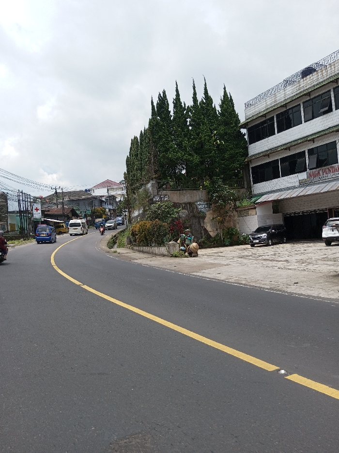This detailed image captures a street scene in a bustling urban environment, which is identified as the city of Chendenbji, Bhutan. The image is taken under an overcast sky, suggesting daytime conditions. A wide asphalt road, marked with a continuous solid yellow center line, dominates the foreground and midground, curving gently to the left and appearing to ascend. On the right side of the road, a wide, gray paved shoulder serves as a parking area. A multi-story commercial building with a white facade and dark-framed windows stands prominently on the right, featuring signage that reads "NAGA PENDAYA" above its ground floor entrance. A dark SUV and a white car are parked in the paved area directly in front of this building. Adjacent to the building, a raised, landscaped retaining wall supports a dense row of tall, slender conifer trees. The weathered wall below the trees displays faded text including "BAKTIE NEGERI", "HOTEL MIING KOKIA", and "NELLA PELEPA". Two individuals are situated on the ground near the base of this wall. One person, wearing a straw hat, is crouched near a pile of organic debris, appearing to be sweeping or gathering. The second individual is also in a low, possibly kneeling, posture nearby. On the left side of the road, in the background, a cluster of residential and commercial structures is visible, along with multiple utility poles laden with an intricate network of overhead electrical or communication wires. A distinct red cross symbol is visible on a sign attached to a structure further down the left side of the street. Traffic is present on the road, moving away from the viewer. Visible vehicles include a blue van, a white van, and a motorcycle with a rider wearing a red helmet. Additional cars are visible further down the curved road. The architectural styles, vehicle types, and visible text on the signage contribute to the scene's character.