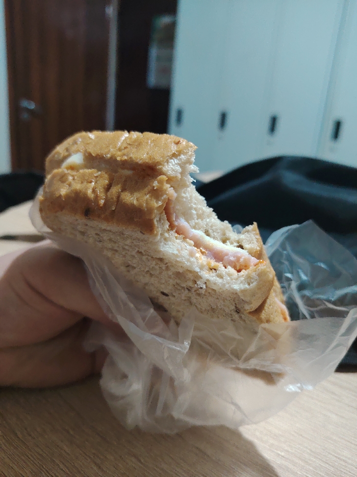 The image captures a close-up view of a human hand holding a partially consumed sandwich, located in the city of Karnare, Bulgaria