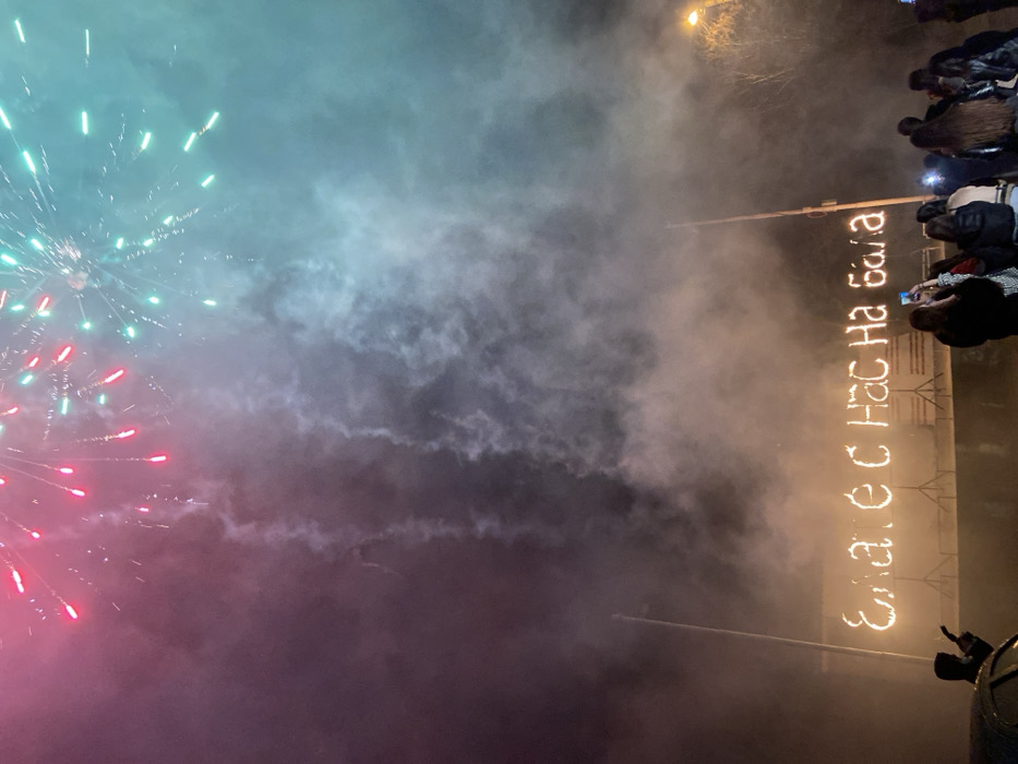 The image depicts a nighttime scene in Lyaskovets, Bulgaria, centered on a public event involving pyrotechnics