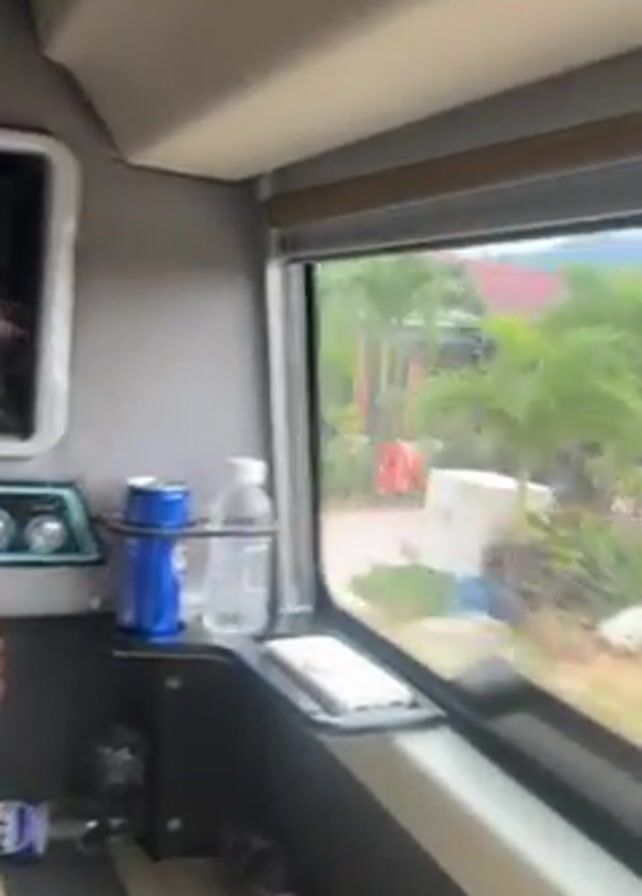 Inside what appears to be a bus, a person is lying down