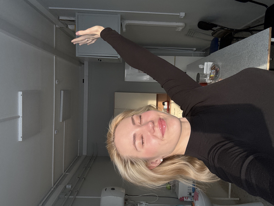 This image depicts a young blonde female in an indoor common area or kitchen in Chaikovsky, Russia
