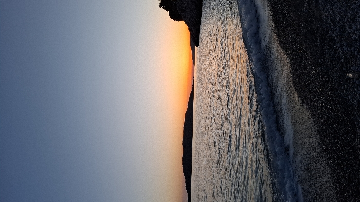 The scene depicts a coastal landscape at sunset in Podbadac, Montenegro. The sky exhibits a gradient, transitioning from a deep blue overhead to a bright orange and yellow glow along the horizon, indicating the setting sun. A body of water, appearing as a sea or large bay, occupies the midground, reflecting the warm colors of the sunset and displaying numerous small ripples across its surface. A dark, elongated landmass is silhouetted against the horizon in the left-center. To the right, a rocky coastline with sparse, dark vegetation is visible, also silhouetted. The immediate foreground consists of a dark, pebbled beach where small waves are observed breaking gently, creating white foam along the shoreline. No individuals or specific man-made objects are discernible within the frame.
