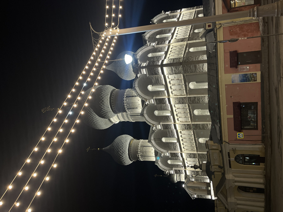 A nighttime image captures a large, illuminated, multi-domed church structure in Kladovitsy, Russia