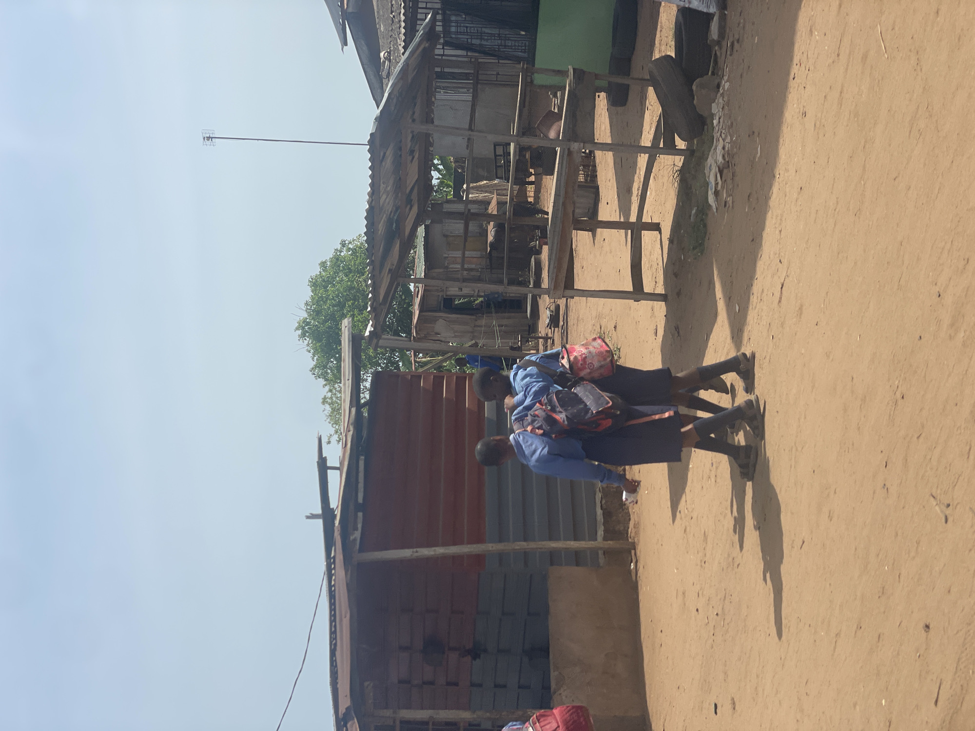 dirt road in Ikoga, Nigeria. Two children in school uniforms are walking along the road, each carrying a backpack. Buildings are present on either side of the road, constructed from brick, corrugated metal, and wood. An antenna is seen extending from the roof of one of the buildings.
