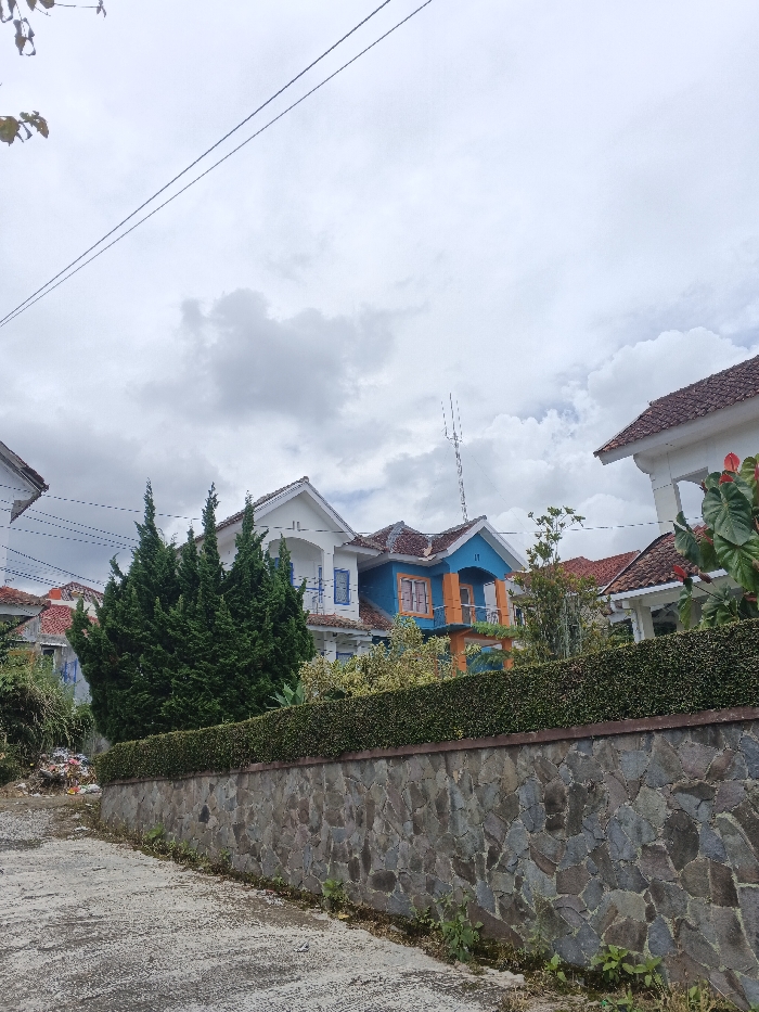 A street view features a stone wall and various houses. One house stands out with bright blue and orange paint. Tall green trees and bushes line the wall, partially obscuring the houses. The sky is overcast. A small antenna is visible atop one of the houses. The street is paved.