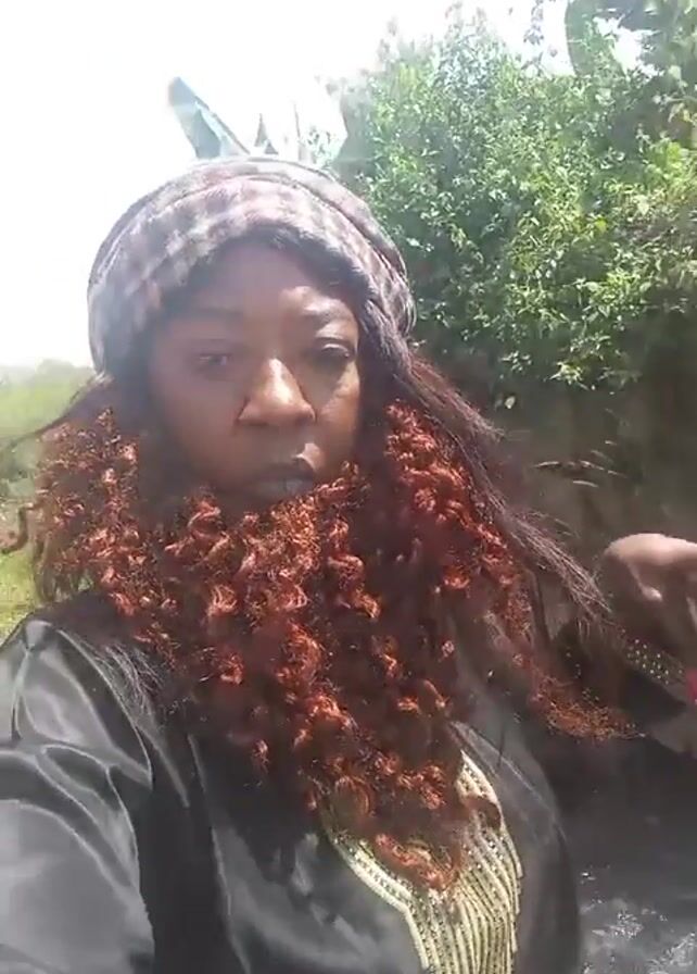 woman with dark skin, wearing a dark satin shirt, a plaid head wrap, and a large, curly, reddish-brown "beard" made of hair. She is holding a phone or camera in front of her, filming a selfie. In the background, there is a lush green area with various plants and trees. As the video progresses, she walks past people, revealing a concrete wall topped with barbed wire. The sky is bright and sunny, creating glare in some shots. The camera moves, showing a water tower in the distance.