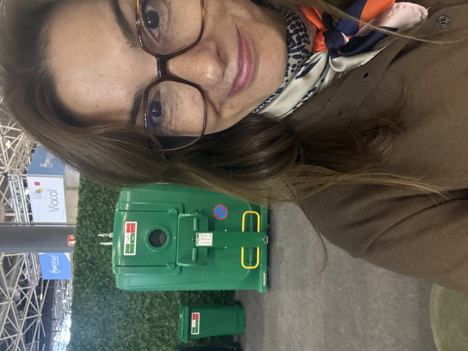 The image captures a woman taking a selfie inside an exhibition hall in Chassieu, France. The woman occupies the right half of the frame, facing the camera with a slight smile. She has long brown hair, wears large brown-framed eyeglasses, a brown cardigan, and a multi-colored silk scarf (cream, navy, orange, light blue) tied around her neck. To the left and slightly behind her, a large, rectangular green industrial glass recycling bin stands prominent. It features a circular glass deposit opening, yellow handles at its base, and branding including "Incit'ať" and a green, white, and red flag-like emblem. A red circular "no parking" sign is affixed to the bin's lower front panel. To the left of the larger bin, a smaller, upright green refuse bin with similar "Incit'ať" branding is visible. Behind the bins, an artificial green hedge wall serves as a backdrop. Above this wall, multiple banners are suspended from the high, industrial-style ceiling, with "Incit'ať" and "Viocol" clearly legible on separate white and blue banners. The floor is a uniform light grey. The setting indicates an indoor trade show or convention center environment.