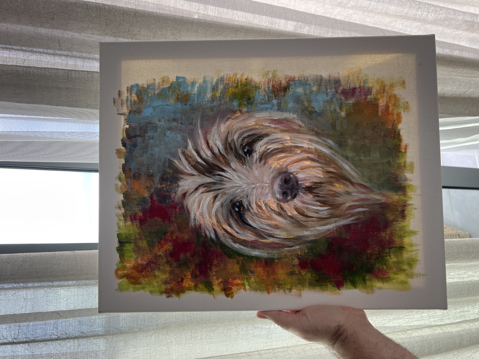 A human hand with visible arm hair is observed holding a vertical rectangular canvas painting indoors in Rafailovići, Montenegro. The painting depicts the head of a dog with shaggy light-brown and white fur, dark eyes, and a dark nose, centered on the canvas. The background of the dog portrait is an abstract composition of vertical and horizontal brushstrokes in various colors, including shades of green, red, blue, and orange. The canvas itself has distinct white unpainted borders around the artwork. The ambient light originates from a window or glass door positioned directly behind the canvas, which is obscured by light-colored, semi-sheer curtains exhibiting vertical folds. The outdoor environment through the window appears overexposed due to bright daylight.