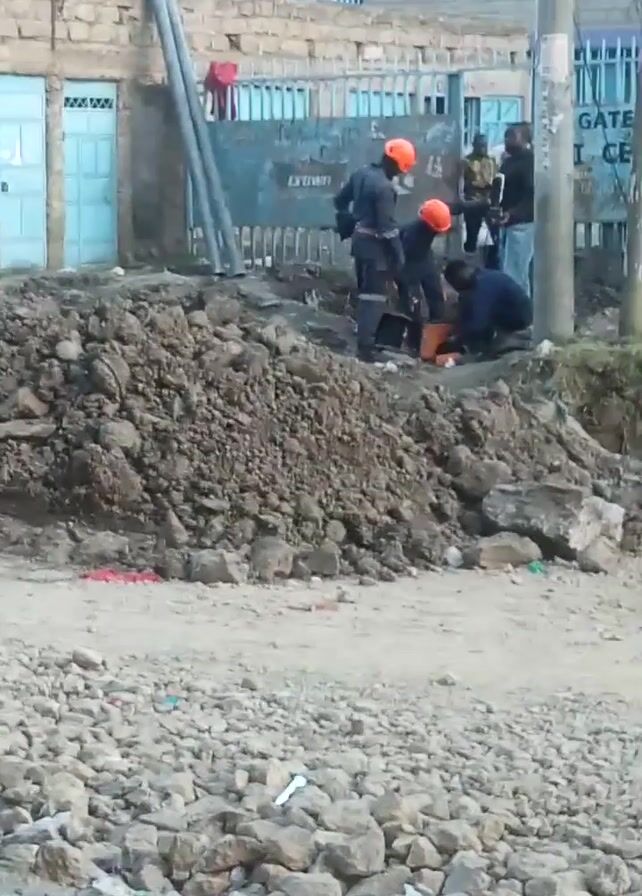 construction site with a pile of dirt in the middle of the frame. A group of people wearing orange helmets and dark blue or black uniforms are standing around what appears to be a machine on the pile of dirt. There are some buildings in the background to the left of the dirt pile. The ground to the right of the dirt pile is covered in gravel. There are some metal poles on the left side of the frame. A child cries in the background.