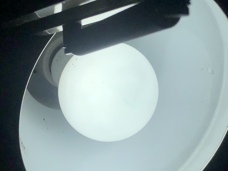 close-up of a white light bulb inside a metal lampshade. There are small dark spots on the light bulb and the lampshade. The image was taken from a low angle, looking up at the light bulb. The location is in Tegucigalpa, Honduras. The coordinates (latitude: 14.094, longitude: -87.159) indicate a residential area. The scene is dimly lit, and there is no indication of any people, subjects, objects, actions, interactions, or the environment other than the light bulb and the lampshade.