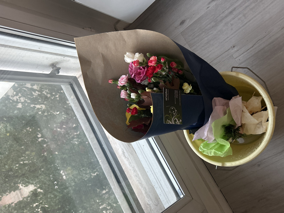 - "An indoor scene in Vanves, France, features a colorful bouquet of flowers prominently placed inside a light yellow plastic bucket on a light-colored wood-effect laminate floor" by FM-CXkga2, licensed under CC BY 4.0