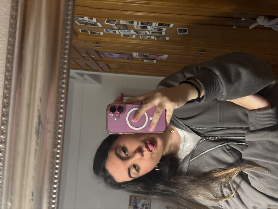 A person poses for a mirror selfie in a dimly lit room. She has dark hair and wears a gray zip-up hoodie. Her phone, encased in a lavender case with a white circle, obscures part of her face as she sticks out her tongue. The mirror has an ornate silver frame. Reflected behind her are a white wall, a wooden dresser covered with photos, and other objects.