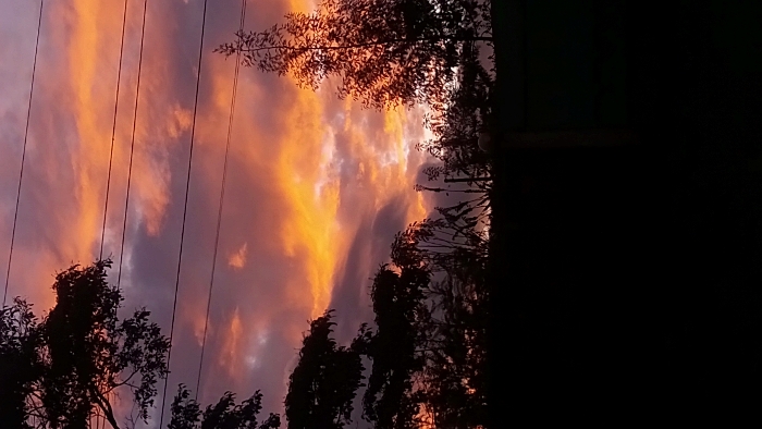 The image displays an evening or morning sky over Ndeiya, Kenya, featuring clouds illuminated with strong orange and purple tones. The lower foreground is rendered in silhouette, showing dense vegetation and tree lines. Distinct silhouetted trees with varied foliage density are visible, particularly on the left and right sides. Three prominent horizontal power or communication lines cross the upper half of the frame. A dark vertical post, likely a fence post, is present on the lower right, partially obscured by the foliage. No human figures or active subjects are discernible within the frame.