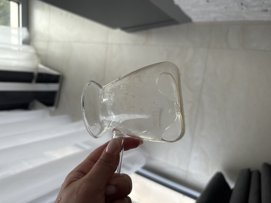 A human right hand, displaying light-colored manicured fingernails and surface moisture, grips the handle of a damaged clear glass vessel. The vessel, styled as a small cezve or pitcher, features a flared rim and is severely compromised at its base, where a substantial section of glass is absent, leaving jagged fragments. The interior contains dark particulate residue and water droplets. The backdrop consists of a light-colored floor and white sheer curtains covering a window or glass door, through which daylight illuminates the scene. Indistinct dark objects are partially visible in the distant background. This scene is located in Budva, Montenegro.