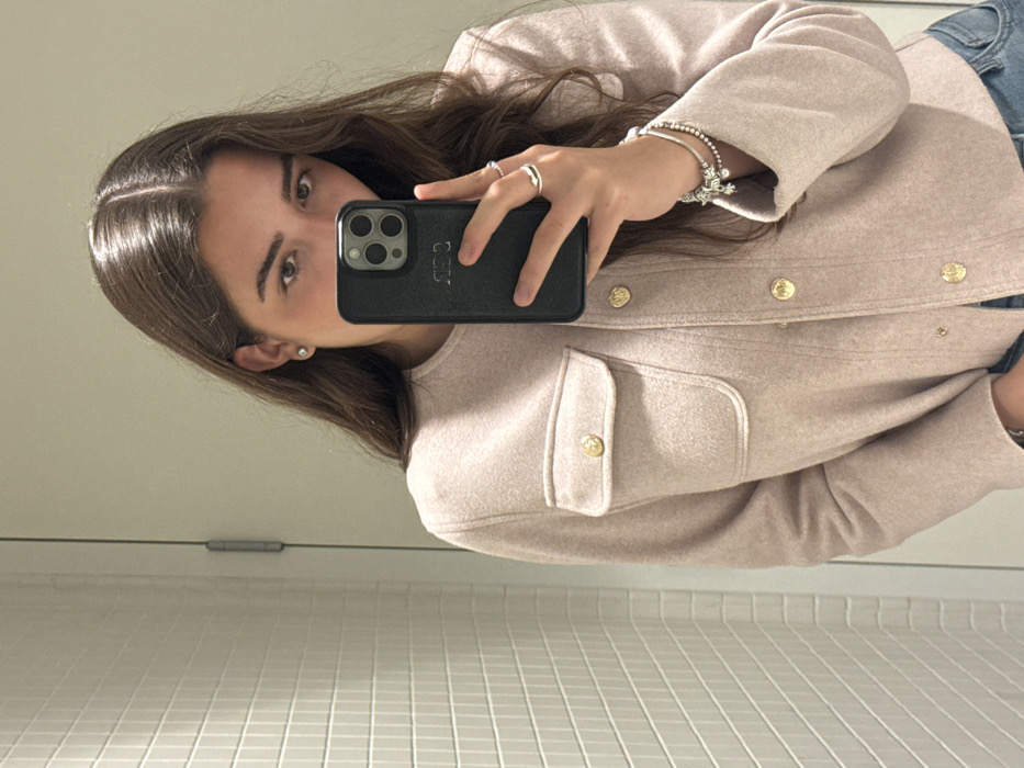 A woman takes a selfie in a bathroom. She holds a black smartphone in front of her face, obscuring part of it. She is wearing a light pink jacket with gold buttons and pockets. Her left hand features a silver ring and a bracelet. The background shows white tiles and a mirror.