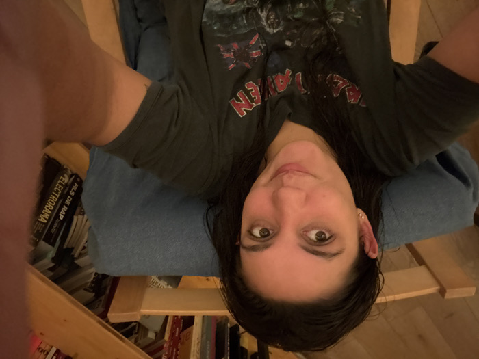 A person with dark hair and brown eyes is looking up at the camera. The person is wearing a dark-colored t-shirt with red and white lettering. They are sitting in a wooden chair with a blue cushion. A bookshelf filled with books is visible to the left of the chair. The photo appears to be taken from an overhead perspective.