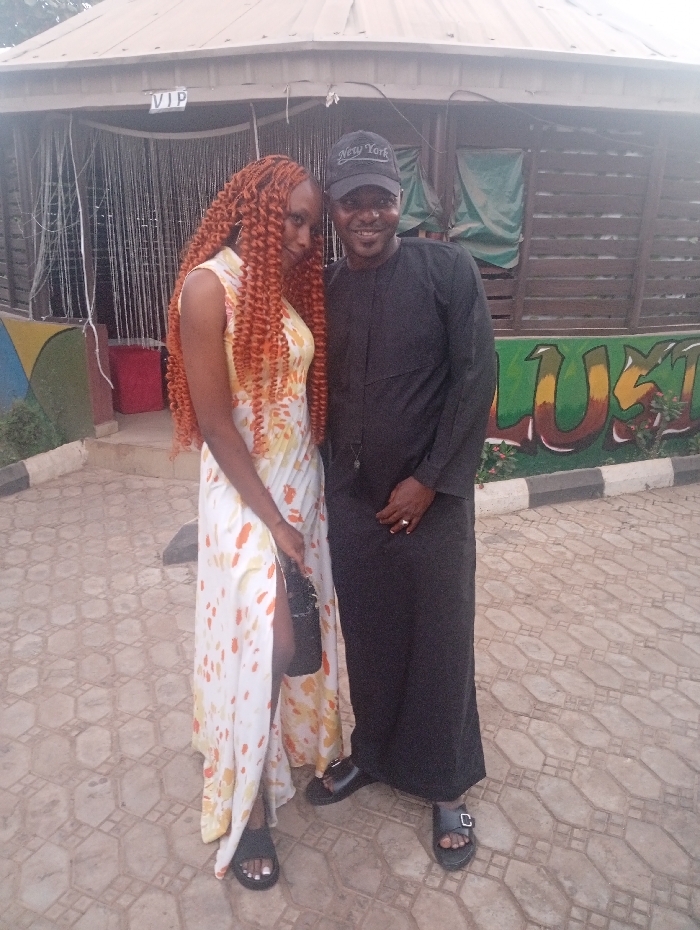 A woman with orange braids in a white dress with orange and yellow accents poses beside a man in a black robe and baseball cap. They stand on a patterned tile surface. Behind them is a structure with a "VIP" sign. A painted word "LUST" is also visible. The man has a ring on his finger. Both are wearing dark sandals. The scene appears to be outdoors.