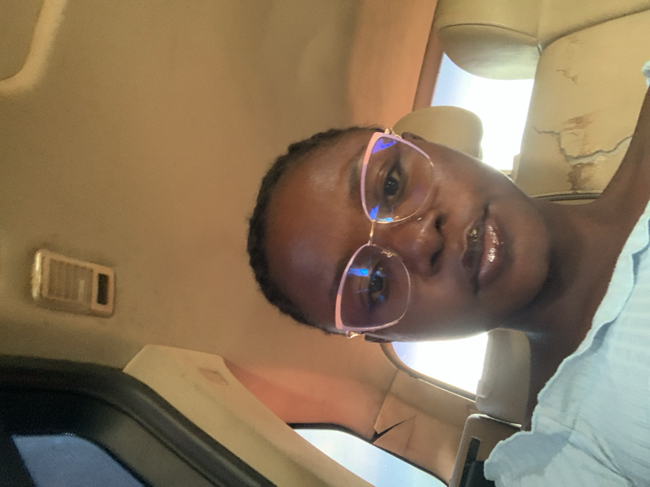 A woman with short black hair wears light pink-framed glasses. She has dark skin and glossy lips. She is wearing a light blue, textured shirt. The setting appears to be inside a car, based on the tan interior, a partially visible seat, and a car vent in the upper left. The image is rotated, making it appear as if the woman is lying down or the photo was taken at an angle. Natural light is visible, suggesting it is daytime.