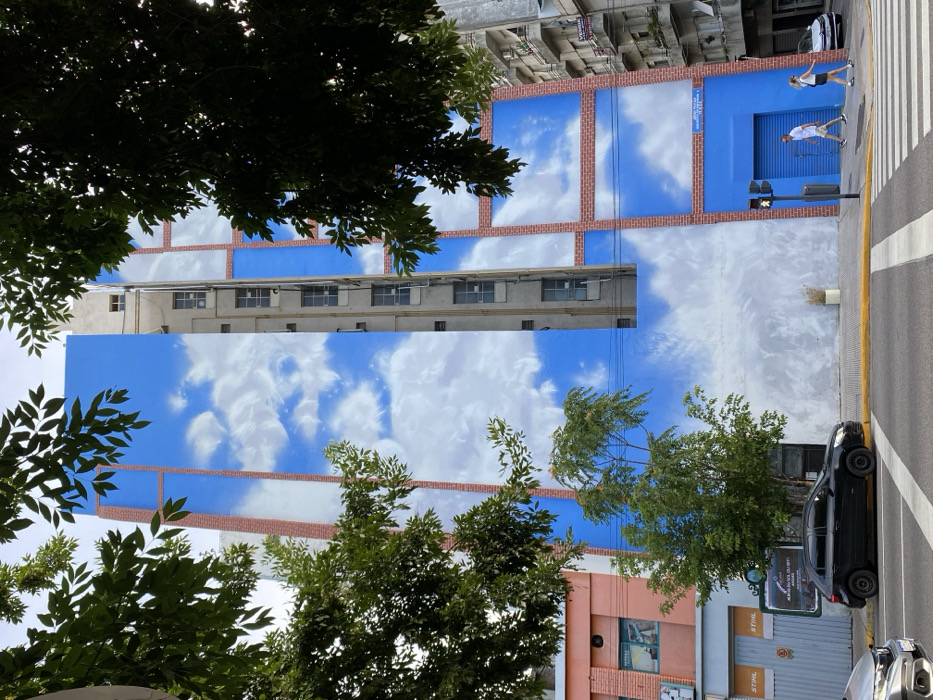 A building with a large mural of blue sky and clouds is seen from a street-level perspective through tree foliage. The building also has a section with a brick pattern and windows. Two people are walking on the sidewalk next to a bright blue section of the mural. Cars are parked on the street. The photo is taken at an angle, with the top of the building tilting to the left.