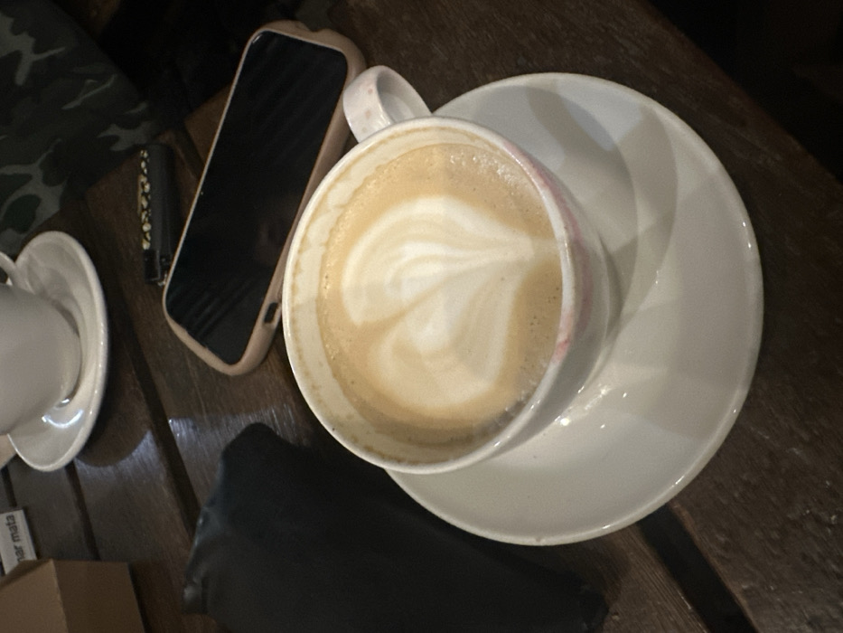 - "A table scene features a white cup of latte art resting on a white saucer, beside a cellphone in a light brown case" by FM-IZ24l2, licensed under CC BY 4.0