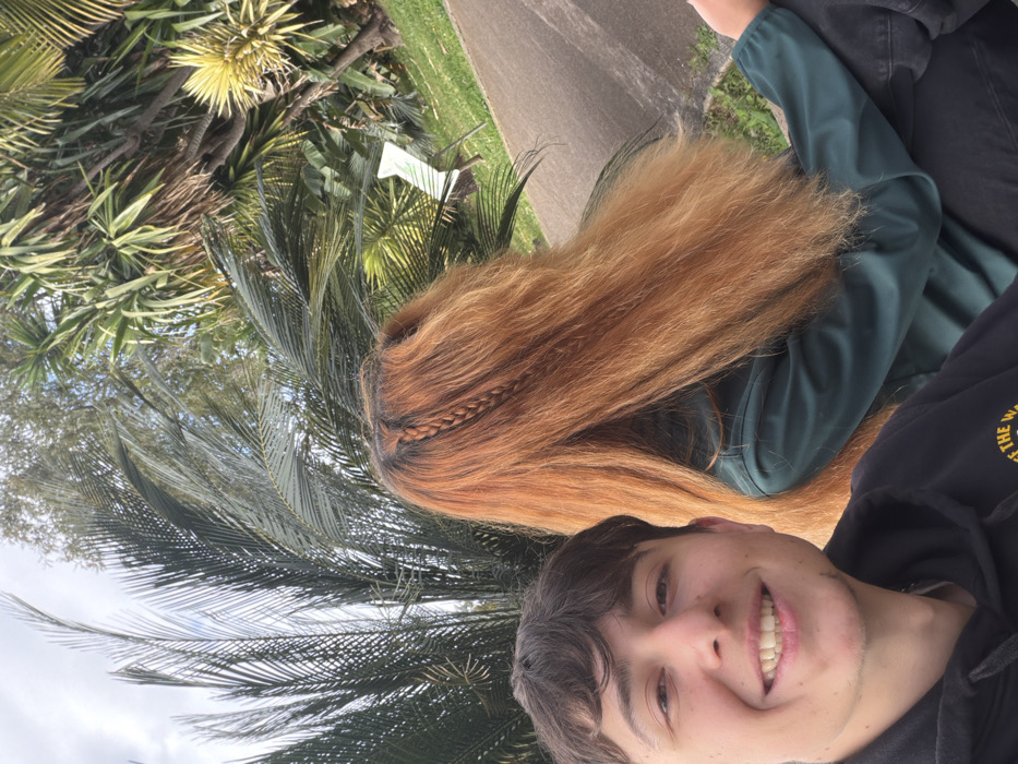 The image captures two individuals in an outdoor, tropical park-like environment in Funchal, Portugal. In the lower-left foreground, a male subject is depicted from the chest up, facing the camera and smiling, revealing his teeth. He has short, dark brown hair and is wearing a dark-colored hoodie with a light-colored "VANS" logo partially visible on the front. Positioned to his right and slightly behind him, a female subject is shown from the back and side, facing away from the camera. She has long, wavy, reddish-blonde hair with a single thin braid visible on the left side of her scalp. She is dressed in a dark teal or green long-sleeved jacket and dark pants, with her left hand resting on her leg. The background consists of dense, lush green tropical foliage, including large palm-like leaves, under an overcast sky with visible patches of blue. A paved pathway is visible on the right side of the image, bordered by green grass. A light-colored, possibly white, object resembling a small chair is partially visible in the mid-ground behind the female subject. The composition suggests the male subject is taking a selfie of himself and the female.