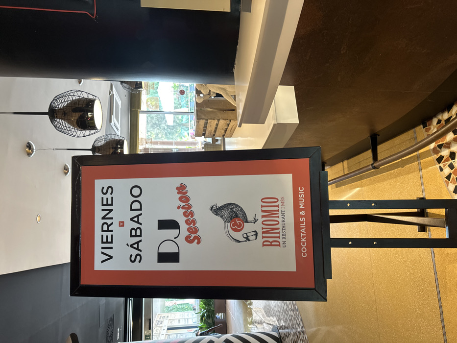 The image captures an indoor scene, likely a restaurant or bar interior, during daytime. A vertical, black-framed promotional sign, approximately 1.5 meters tall, stands on a black metal easel in the foreground. The sign features a white background with a red border and black text. The upper section reads "VIERNES Y SÁBADO" (Friday and Saturday), followed by "DJ Session" with "Session" in stylized red cursive. Below this, a black and white illustration depicts a chicken or hen alongside a red ampersand and a cocktail shaker. The lower part of the sign identifies the establishment as "BINOMIO UN RESTAURANT I MÉS" (A Restaurant and More) and advertises "COCKTAILS & MUSIC" on a red background. To the right of the sign, a white-topped counter or bar with a dark brown paneled base extends into the background. Above the counter, two prominent modern pendant lights, featuring black wireframe cages and metallic interior shades, hang from a white ceiling. A third similar light is partially visible. An air conditioning vent is present on the ceiling. A solid black pillar stands behind the counter on the right. On the far left, a black and white striped pillar is partially visible. The floor in the foreground consists of large yellowish-beige tiles, transitioning to a decorative mosaic band of brown, beige, and white irregular hexagonal tiles along the base of the counter. A dark metal handrail is attached to the counter's lower section. Through large glass panels or doors in the background, an outdoor area is visible, featuring green foliage, trees, and white outdoor umbrellas. Wooden crates are also present in this area. No individuals are depicted in the scene. The location is Cornellà de Llobregat, Spain.