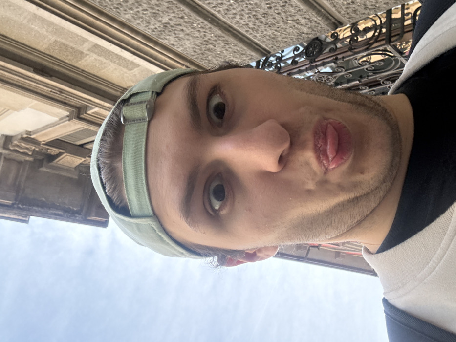 A close-up, low-angle image depicts a male individual outdoors. The subject, positioned centrally in the foreground, has dark hair visible beneath a light green baseball cap worn backward, and light facial stubble. He wears a black shirt under a white garment and a dark strap, possibly from a bag, over his left shoulder. His eyes are wide open, and his tongue protrudes slightly from his mouth, conveying an exaggerated expression. The background on the right and top features a building facade constructed from light-colored, textured stone or stucco, exhibiting classical architectural elements including a prominent cornice. A section of dark, ornate wrought-iron work, likely part of a gate or railing, is visible on the far right. The upper left quadrant of the image shows a light blue sky with minimal cloud cover. The architectural style of the building is characteristic of structures found within the historic city center of Milan, Italy.