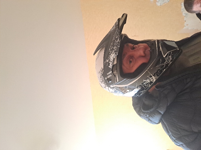 The image displays an interior scene, identified as being captured in Bolshaya Elhovka, Russia. The primary subject, an adult male, is positioned in the foreground, facing directly towards the viewer. He is wearing a dark grey and white full-face off-road motorcycle helmet, emblazoned with a "hot traxx" logo and a distressed, shattered-effect graphic design. His face, with light skin and a neutral expression, is visible through the helmet's open eye port. He is dressed in a dark, possibly black, hooded puffer jacket over a lighter-colored shirt. A second individual's head is partially visible out of frame in the bottom right corner. The background features two distinct interior walls: the left wall is a uniform light yellow or beige, while the right wall shows significant patches of peeled plaster or paint, revealing an underlying lighter surface. The ceiling is white and appears evenly lit. No direct interaction between the two individuals is discernable within the visible frame.