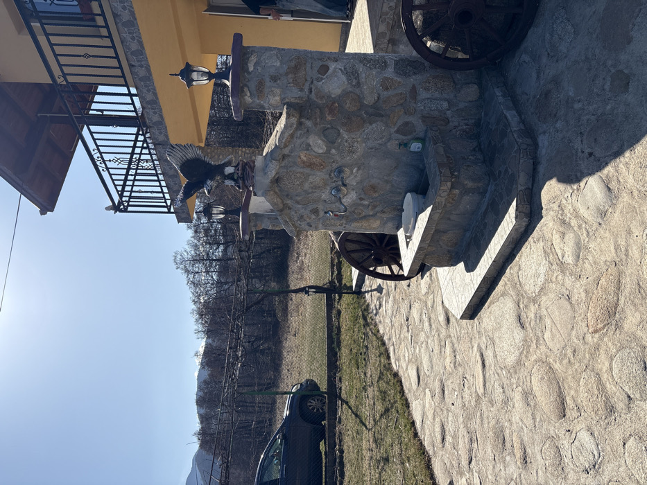 The image depicts an outdoor scene in Dolna Banya, Bulgaria, under bright sunlight. In the foreground, a paved surface composed of irregular, light-colored stones extends across the lower portion of the frame. Centrally located in the midground is a robust, rustic outdoor water feature constructed from various sizes of grey and brown stones. This structure includes a lower sink basin containing a white plastic bucket and a green pump bottle, likely soap, on its rim. Two metal spigots are visible above the basin. Flanking the main stone structure are two large, dark brown wooden wagon wheels, each leaning against the stone. The upper part of the stone structure features two black lantern-style lights on either side, and a large, dark-colored statue of an eagle with wings spread, mounted centrally. To the right of the stone feature is a portion of a yellow-painted building with a dark metal balcony railing on its upper level. The lower right edge of the frame shows the legs of an individual standing near an open doorway of this building. Behind the stone water feature, a chain-link fence separates the paved area from a grassy field. A dark-colored SUV is parked on the grass to the left, adjacent to the fence. Above the fence and SUV, a trellis structure with bare vines stretches horizontally. In the distant background, a line of deciduous trees without foliage stands before a field of dry grass, with prominent mountains or hills visible under a clear, bright blue sky. Distinct shadows are cast across the paved ground, indicating direct sunlight.