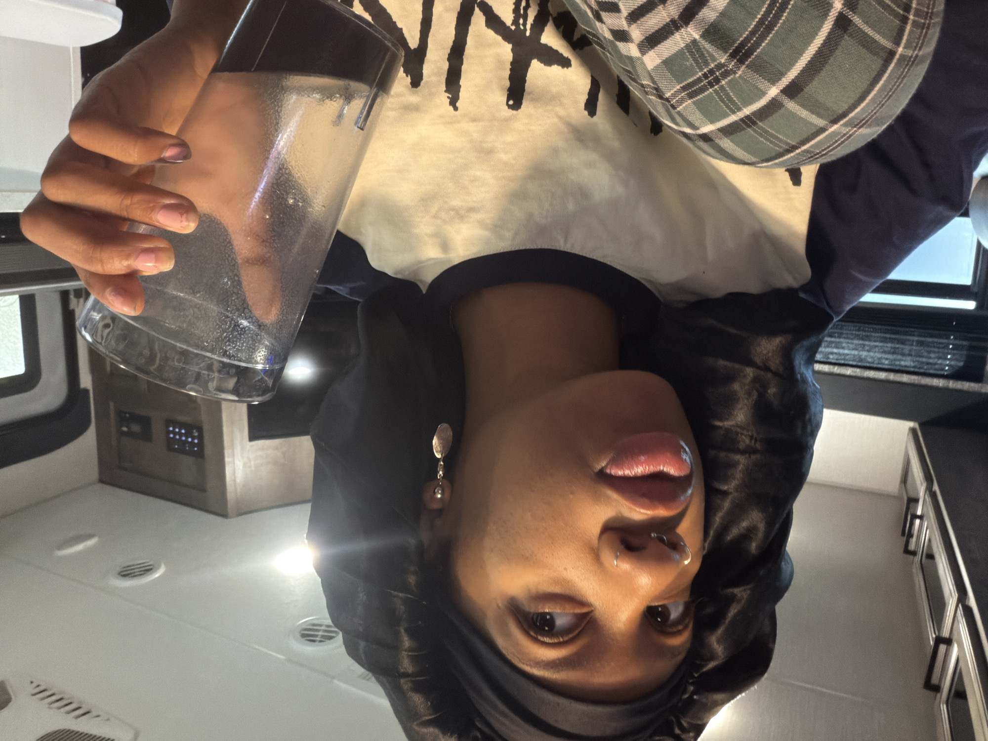 A woman is holding a glass of water. She is wearing a black head covering and a t-shirt. She has a nose ring and earrings. The background appears to be an interior of a recreational vehicle or trailer. The location is unknown.