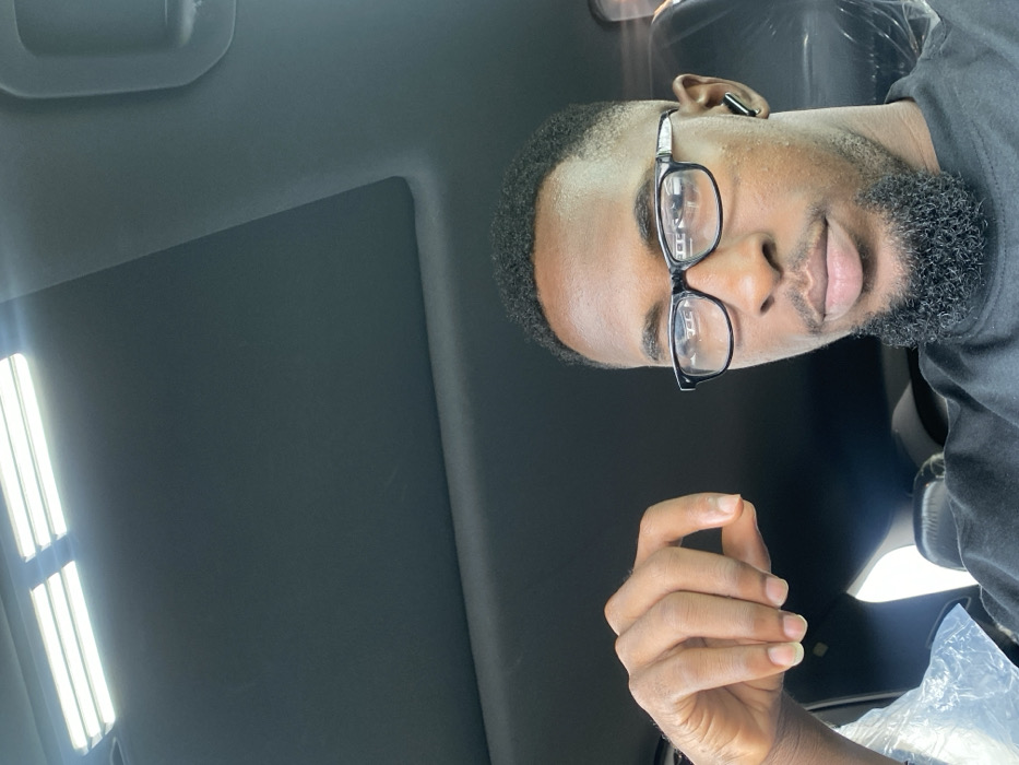 A single young adult male is depicted in a close-up, selfie-style photograph taken inside what appears to be a vehicle. The male, with dark skin, short faded hair, and a neatly trimmed dark beard, is wearing black-framed eyeglasses and a black wireless earbud in his left ear. His right hand is raised to the left of his face, with the index finger and thumb slightly pinched together. He maintains a neutral facial expression, looking directly towards the camera. The vehicle's interior features a dark headliner, and two illuminated rectangular overhead light fixtures are visible in the upper left of the frame. A seat covered in clear plastic protective wrap is partially visible in the background to the male's right. The specific city of Igboefon, Nigeria, cannot be confirmed from the visual information within the image.