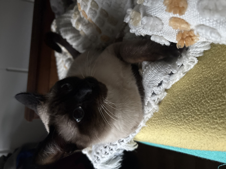 - "A Siamese cat with dark brown points is lying on its back amidst layers of textures" by FM-ErVNw2, licensed under CC BY 4.0
