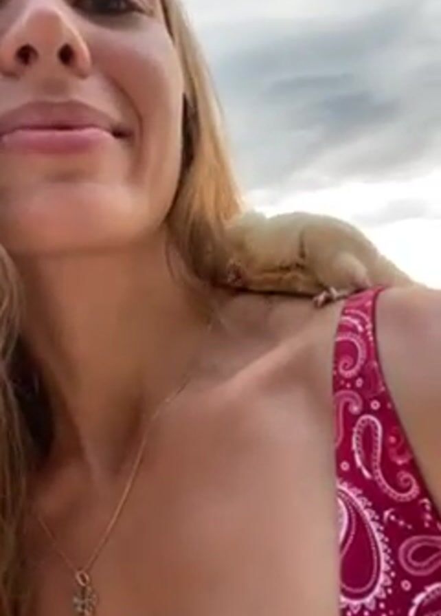 A woman with long, light brown hair, wearing a paisley print swimsuit top and a delicate necklace, holds the camera up in a selfie pose, focusing on her face and the white animal perched on her left shoulder