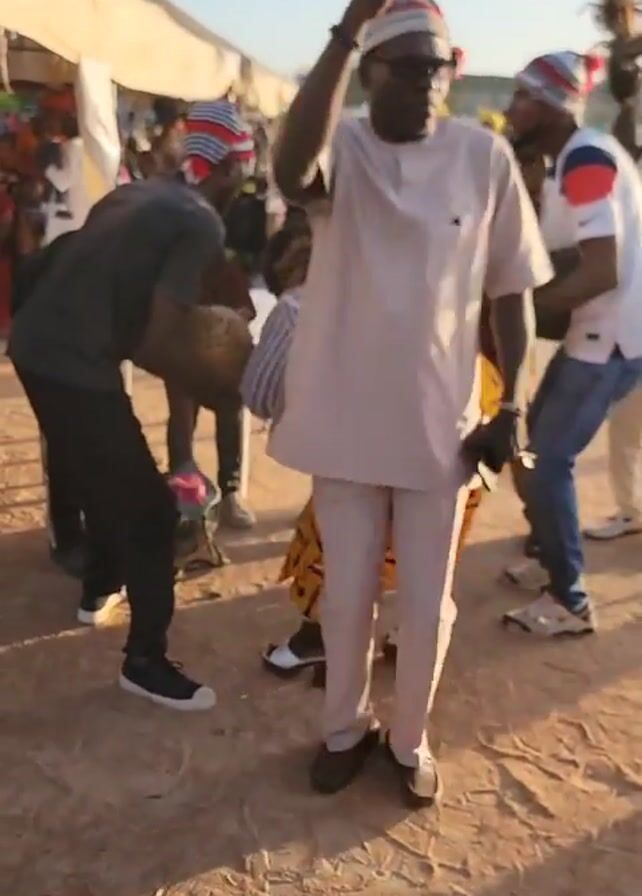 A group of people dressed in traditional garb dance to the beat of a drum on a dirt field. A man in a light-colored suit and striped hat raises his hands in the air, dancing while holding a phone. A drummer plays nearby, and other men in similar hats join in the dance. A white tent provides shade in the background, and the scene is bathed in warm sunlight.