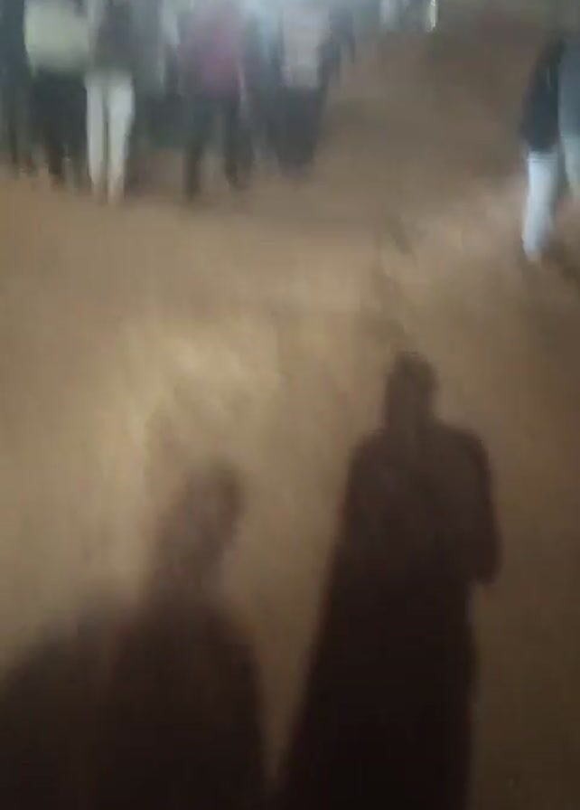 night scene with a crowd of people walking on a dirt road. The light is poor, and the image is blurry, with the primary light source creating lens flare. Shadows of two people are visible in the foreground, suggesting the camera is held by one of them. The figures in the crowd appear to be walking in a disorganized fashion, with varying clothing styles. In the background, a building with lit windows is seen. Overall, the video depicts a somewhat chaotic, poorly lit outdoor environment.