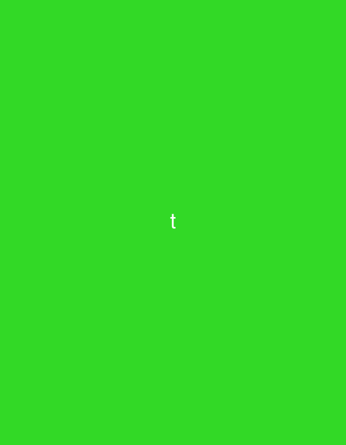 A vibrant green background dominates the image. Centered horizontally and vertically is the lowercase letter "t" in a crisp, white font. The simplicity of the design draws attention to the single letter against the solid backdrop. The letter is clear and legible, positioned for maximum visibility in the frame.