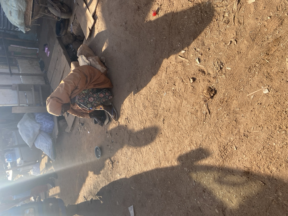 The image depicts an outdoor scene in Nassarawa, Nigeria. An individual, appearing elderly, is seated on unpaved reddish-brown dirt ground, leaning against rough stones. They wear a light brown head covering, a matching outer garment, and patterned trousers, with flip-flops on their feet. Directly in front of the individual, a small, dark metal bowl containing several coins rests on the ground. Strong sunlight originates from the upper left, casting long, dark shadows across the dusty foreground, which contains scattered debris and tire tracks. In the background, several makeshift structures resembling market stalls are visible. These structures are accompanied by stacked white and bundled blue sacks, wooden planks, and miscellaneous materials. A partial view of a wheelbarrow is present on the far right, and indistinct human figures are visible on the far left.