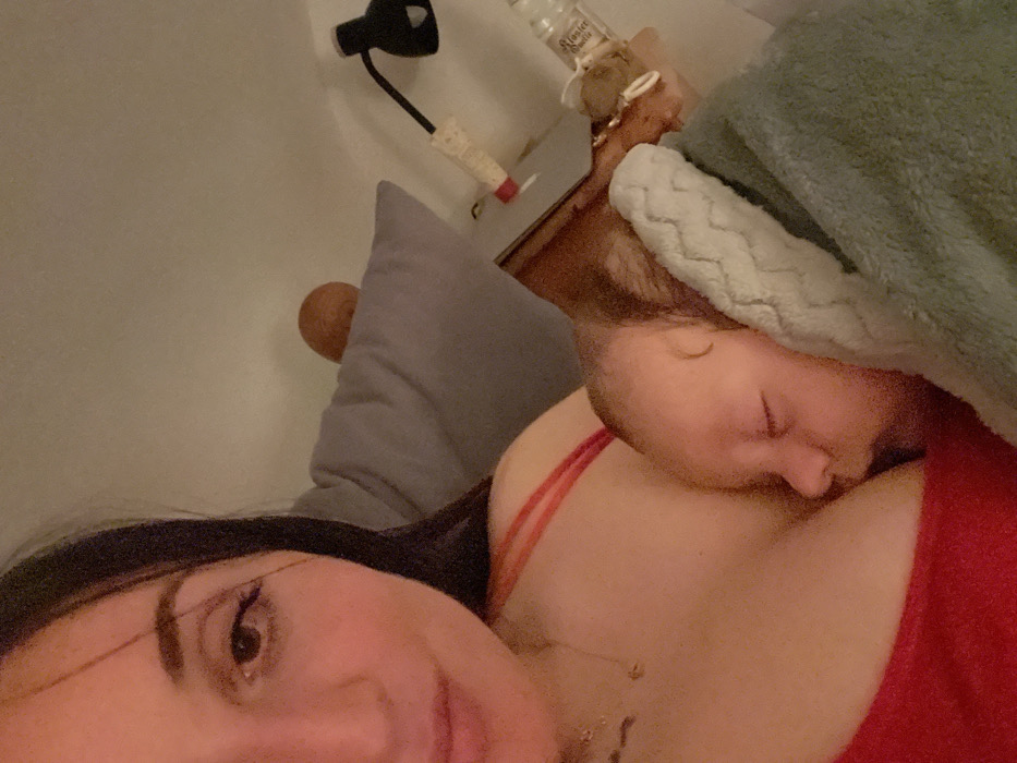 A selfie shows a woman with dark hair and a baby nestled against her chest, both appearing to be asleep