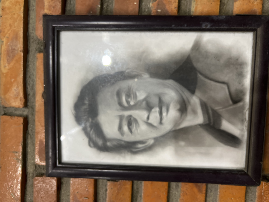 A framed black and white portrait, likely a charcoal drawing, depicts an East Asian man, approximately middle-aged, with a gentle smile and dark, wavy hair