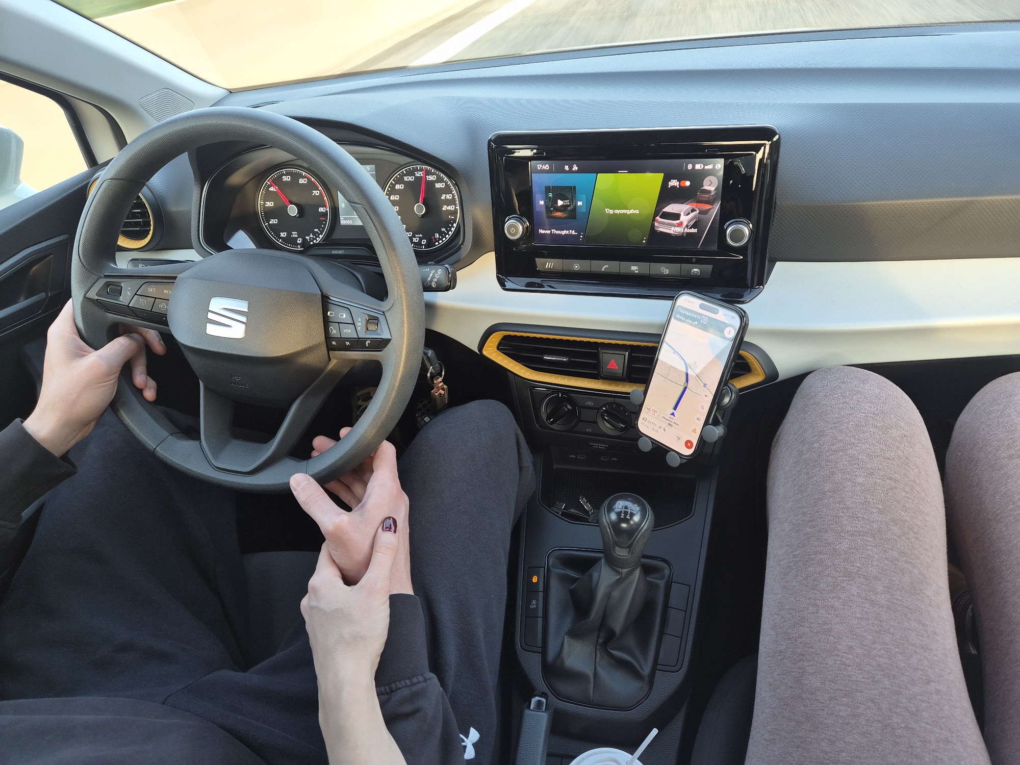 The image depicts the interior of a moving automobile, viewed from a rear passenger perspective, within the Municipal Unit of Megara, Greece. Two occupants are partially visible. The driver's hands are positioned on the black, multi-function steering wheel, bearing a "SEAT" logo. The driver wears dark long-sleeved clothing and dark sweatpants. The driver's left hand is interlaced with the right hand of the front passenger. The passenger's legs are visible, covered in light brown leggings. The passenger's right hand displays dark red nail polish. The vehicle's dashboard features a two-tone design of black and off-white/beige, with a distinctive yellow trim surrounding the central air vent on the passenger side. The instrument cluster shows an analog speedometer indicating approximately 50 km/h, and a digital display beneath it reads "08:00". The central infotainment touchscreen displays the time "17:45", music information including "Never Thought I'd..." and Greek text "Όχι αγαπημένα", and a graphic for "Front Assist". A smartphone is secured in a dashboard mount, displaying a navigation application (Google Maps) with a current speed of 42 km/h, a route to "Chaïdari", and an estimated arrival time of "17:39". The vehicle is equipped with a manual 5-speed gear shift. The center console contains keys on a keyring, a white cup with a straw, and an illuminated red hazard warning light button. Through the windshield, a clear road, consistent with a highway, is visible under bright daylight conditions.