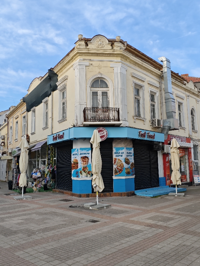 - "The image displays a two-story corner building situated on a paved pedestrian area in the city of Pomorie, Bulgaria, under a partially cloudy blue sky" by FM-xCddJ3, licensed under CC BY 4.0