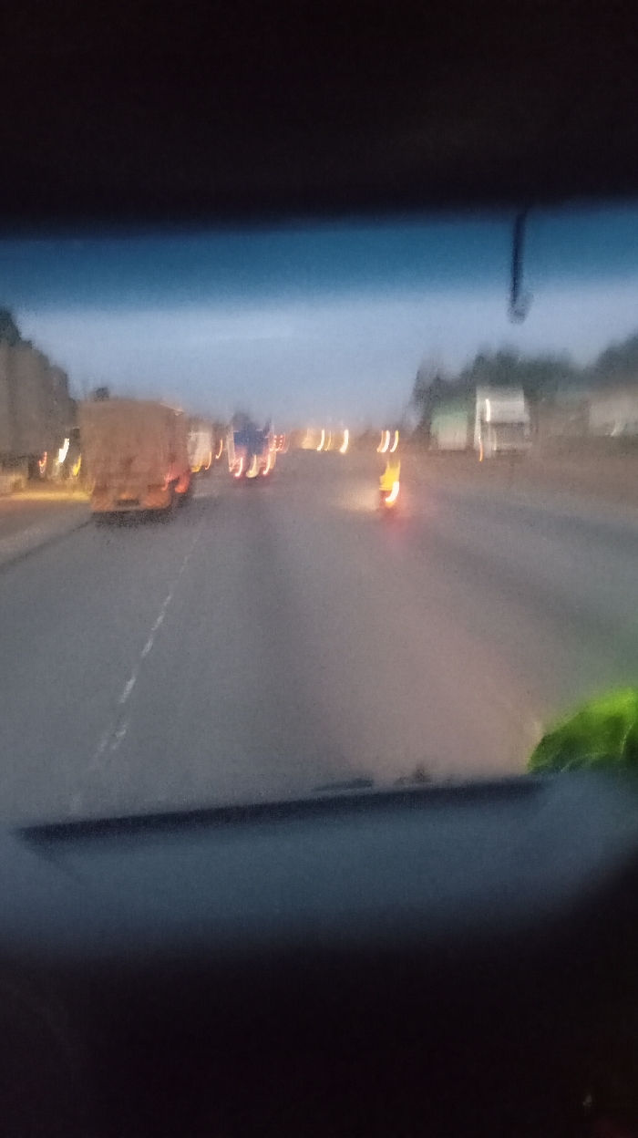 A blurry, out-of-focus view from inside a vehicle looking out onto a road. Several vehicles, including what appear to be trucks, are visible on the road ahead, along with blurred lights. The sky is overcast or dusk is approaching. A portion of the vehicle's dashboard and windshield are visible in the foreground, adding to the obscured perspective. The overall impression is of motion and unclear visibility.