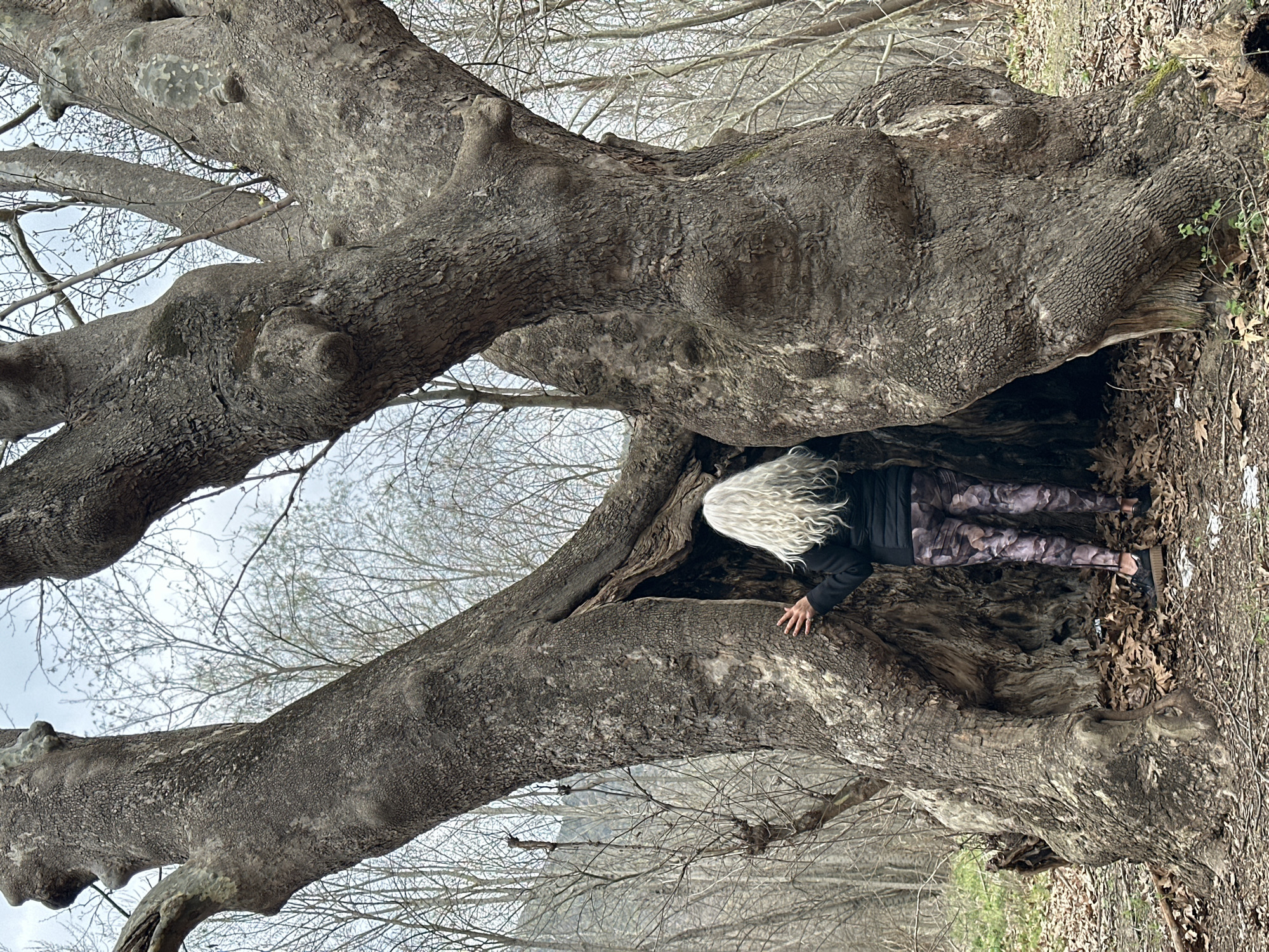 A photograph, rotated ninety degrees clockwise, depicts a person standing within a hollowed-out tree trunk in a wooded area