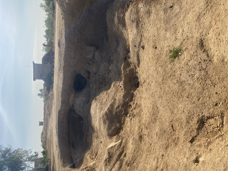 A landscape featuring sandy terrain with an eroded cliff face. Two cave-like openings are visible within the cliff. In the background, a stone structure with a cross on top suggests a building, possibly a church or monument. The overall scene conveys an arid environment with signs of both natural erosion and potential human-made structures. The image has a vertical orientation and bright lighting.